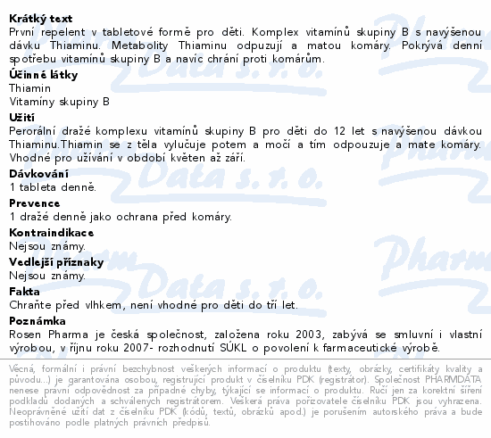První repelent v tabletové formě pro děti. Komplex vitamínů skupiny B s navýšenou dávku Thiaminu. Metabolity Thiaminu odpuzují a matou komáry. Pokrývá denní spotřebu vitamínů skupiny B a navíc chrání proti komárům.