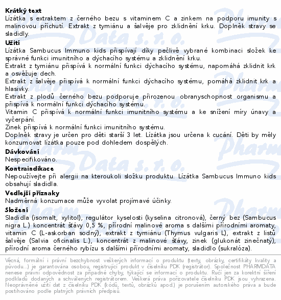 Lízátka s extraktem z černého bezu s vitaminem C a zinkem na podporu imunity s malinovou příchutí. Extrakt z tymiánu a šalvěje pro zklidnění krku. Doplněk stravy se sladidly.