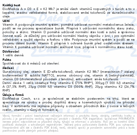 EkoMedica A + D3 + E + K2 Mk7 Junior je směsí všech vitamínů rozpustných v tucích a to v kapalné, snadno vstřebatelné formě, stabilizované směsí tokoferolů ze slunečnicového oleje.
