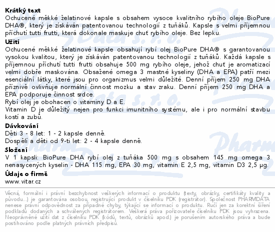Ochucené měkké želatinové kapsle s obsahem vysoce kvalitního rybího oleje BioPure DHA®, který je získáván patentovanou technologií z tuňáků. Kapsle s velmi příjemnou příchutí tutti frutti, která dokonale maskuje chuť rybího oleje. Bez lepku.