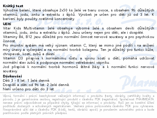 Výhodné balení, které obsahuje 2x50 ks želé ve tvaru ovoce, s obsahem 9ti důležitých vitaminů, jodu, zinku a extraktu z šípků. Výrobek je určen pro děti již od 3 let. K barvení byly použity rostlinné koncentráty.