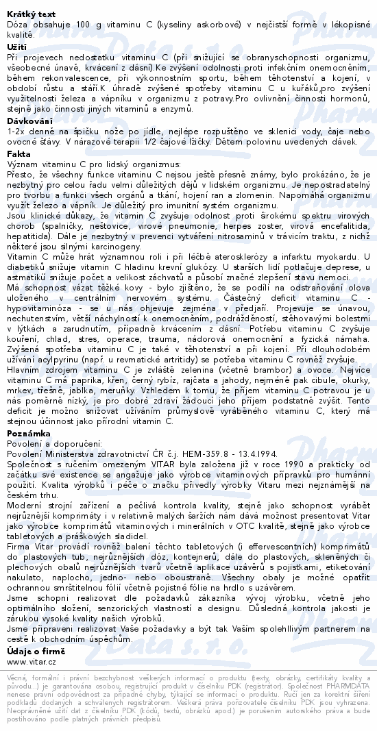 Dóza obsahuje 100 g vitaminu C (kyseliny askorbové) v nejčistší formě v lékopisné kvalitě.