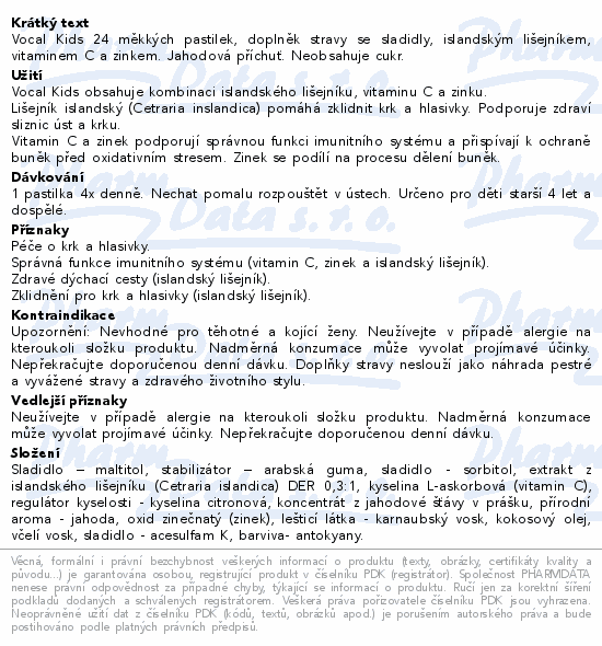 Vocal Kids 24 měkkých pastilek, doplněk stravy se sladidly, islandským lišejníkem, vitaminem C a zinkem. Jahodová příchuť. Neobsahuje cukr.