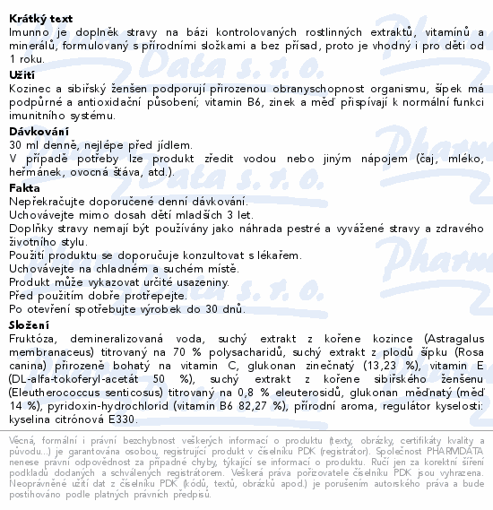 Imunno je doplněk stravy na bázi kontrolovaných rostlinných extraktů, vitamínů a minerálů, formulovaný s přírodními složkami a bez přísad, proto je vhodný i pro děti od 1 roku.