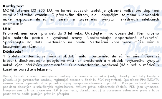 MOVit vitamin D3 800 I.U. ve formě cucacích tablet je výborná volba pro doplnění velmi důležitého vitamínu D především dětem, ale i dospělým, zejména v obdobích nízké expozice slunečního záření a zvýšeného výskytu nakažlivých infekčních onemocnění.