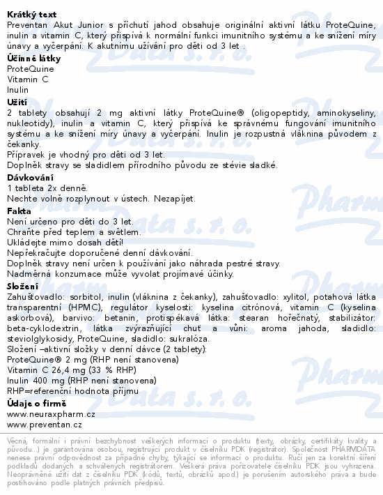 Preventan Akut Junior s příchutí jahod obsahuje originální aktivní látku ProteQuine, inulin a vitamin C, který přispívá k normální funkci imunitního systému a ke snížení míry únavy a vyčerpání. K akutnímu užívání pro děti od 3 let .