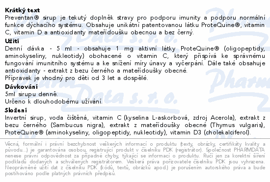 Preventan® sirup je tekutý doplněk stravy pro podporu imunity a podporu normální funkce dýchacího systému. Obsahuje unikátní patentovanou látku ProteQuine®, vitamin C, vitamin D a antioxidanty mateřídoušku obecnou a bez černý.