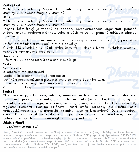 Multivitaminové želatinky Rakytníček+ obsahují rakytník a směs ovocných koncentrátů a vitaminy. 20% ovocné šťávy a 9 vitaminů.