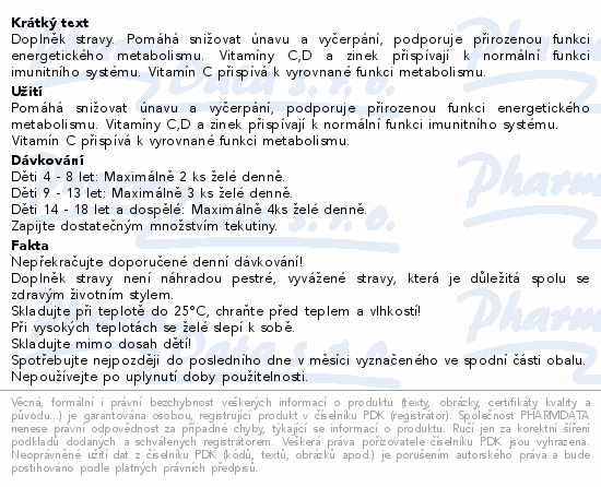 Doplněk stravy. Pomáhá snižovat únavu a vyčerpání, podporuje přirozenou funkci energetického metabolismu. Vitamíny C,D a zinek přispívají k normální funkci imunitního systému. Vitamín C přispívá k vyrovnané funkci metabolismu.