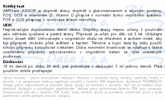 AMPcare JUNIOR je doplněk stravy doplněk s glukomannanem a sójovými proteiny, FOS, GOS a vitaminem D. Vitamin D přispívá k normální funkci imunitního systému. FOS a GOS přispívají k rovnováze střevní mikroflóry.