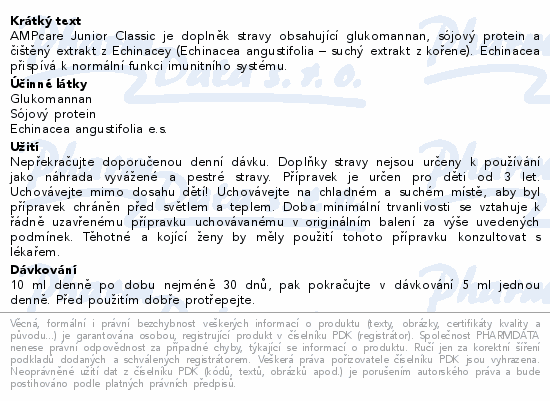 AMPcare Junior Classic je doplněk stravy obsahující glukomannan, sójový protein a čištěný extrakt z Echinacey (Echinacea angustifolia – suchý extrakt z kořene). Echinacea přispívá k normální funkci imunitního systému.