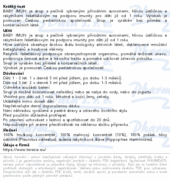 BABY IMUN je sirup s pečlivě vybranými přírodními surovinami, hlívou ústřičnou a rakytníkem řešetlákovým na podporu imunity pro děti již od 1 roku. Výrobek je posouzen Českou pediatrickou společností. Sirup je vyráběn bez příměsí a konzervačních látek.