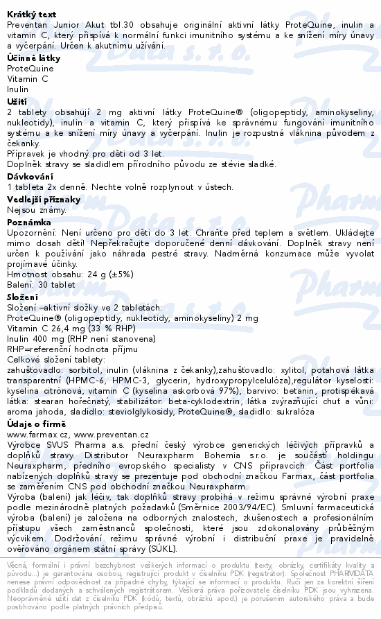 Preventan Junior Akut tbl.30 obsahuje originální aktivní látky ProteQuine, inulin a vitamin C, který přispívá k normální funkci imunitního systému a ke snížení míry únavy a vyčerpání. Určen k akutnímu užívání.