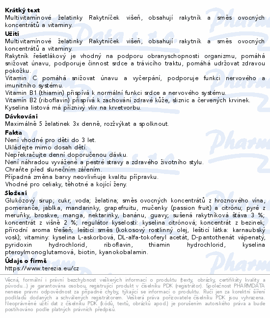 Multivitamínové želatinky Rakytníček Višeň, obsahují rakytník a směs ovocných koncentrátů a vitaminy.