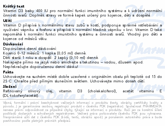 Vitamin D3 baby 400 IU pro normální funkci imunitního systému a k udržení normální činnosti svalů. Doplněk stravy ve formě kapek určený pro kojence, děti a dospělé.