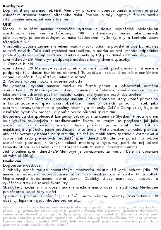 Doplněk stravy spermidineLIFE® Memory+ přispívá k obnově buněk a chrání je před oxidačním stresem pomocí přidaného zinku. Podporuje taky kognitivní funkce mozku díky obsahu železa, šafránu a Brahmi.
