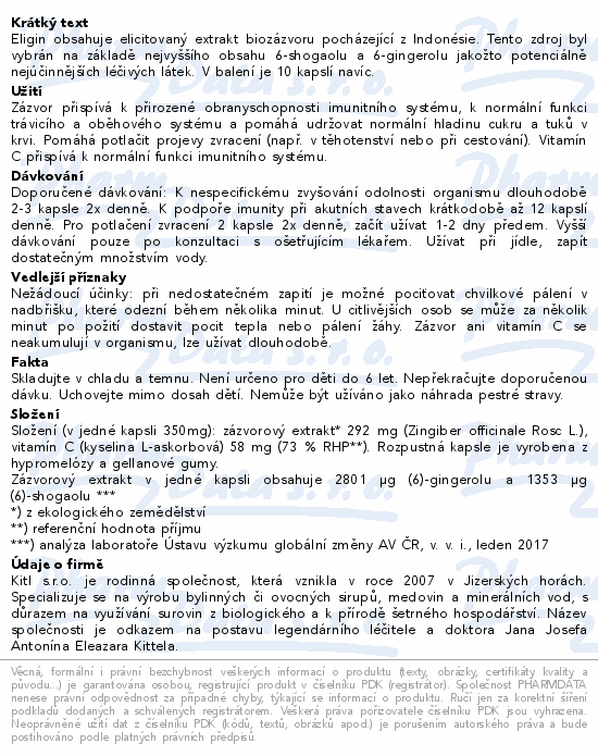 Eligin obsahuje elicitovaný extrakt biozázvoru pocházející z Indonésie. Tento zdroj byl vybrán na základě nejvyššího obsahu 6-shogaolu a 6-gingerolu jakožto potenciálně nejúčinnějších léčivých látek. V balení je 10 kapslí navíc.
