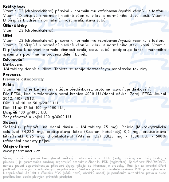 Vitamin D3 (cholecalciferol) přispívá k normálnímu vstřebávání/využití vápníku a fosforu. Vitamin D přispívá k normální hladině vápníku v krvi a normálního stavu kostí. Vitamin D přispívá k udržení normální činnosti svalů, stavu zubů.