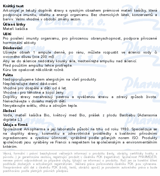 Arkoroyal je tekutý doplněk stravy s vysokým obsahem prémiové mateří kašičky, která podporuje imunitu, vitalitu a energii organismu. Bez chemických látek, konzervantů a barviv. Velmi vhodné v období změny sezon.