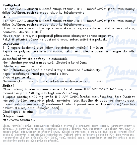B17 APRICARC obsahuje kromě zdroje vitaminu B17 – meruňkových jader, také houby (hlívu ústřičnou, reishi) a plody rakytníku řešetlákového.