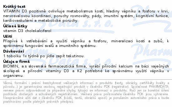 VITAMIN D3 pozitivně ovlivňuje metabolismus kostí, hladiny vápníku a fosforu v krvi, nervosvalovou koordinaci, poruchy rovnováhy, pády, imunitní systém, kognitívní funkce, kardiovaskulární a metabolické poruchy.