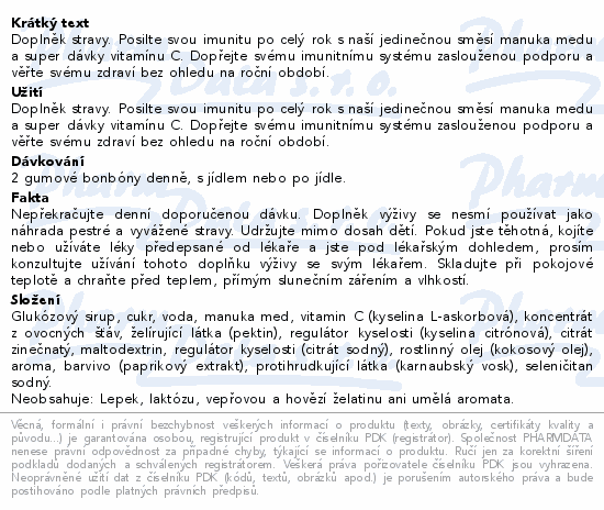 Doplněk stravy. Posilte svou imunitu po celý rok s naší jedinečnou směsí manuka medu a super dávky vitamínu C. Dopřejte svému imunitnímu systému zaslouženou podporu a věřte svému zdraví bez ohledu na roční období.