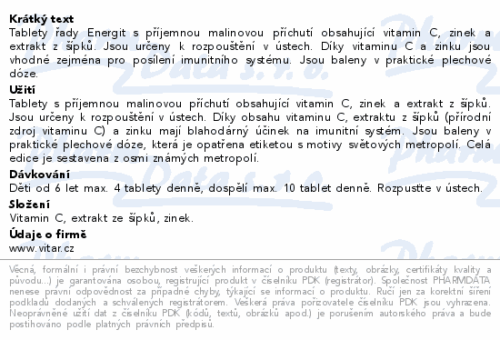 Tablety řady Energit s příjemnou malinovou příchutí obsahující vitamin C, zinek a extrakt z šípků. Jsou určeny k rozpouštění v ústech. Díky vitaminu C a zinku jsou vhodné zejména pro posílení imunitního systému. Jsou baleny v praktické plechové dóze.