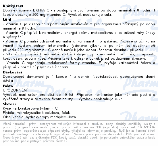 Doplněk stravy - EXTRA C - s postupným uvolňováním po dobu minimálně 8 hodin. 1 kapsle obsahuje 500 mg vitamínu C. Výrobek neobsahuje cukr.