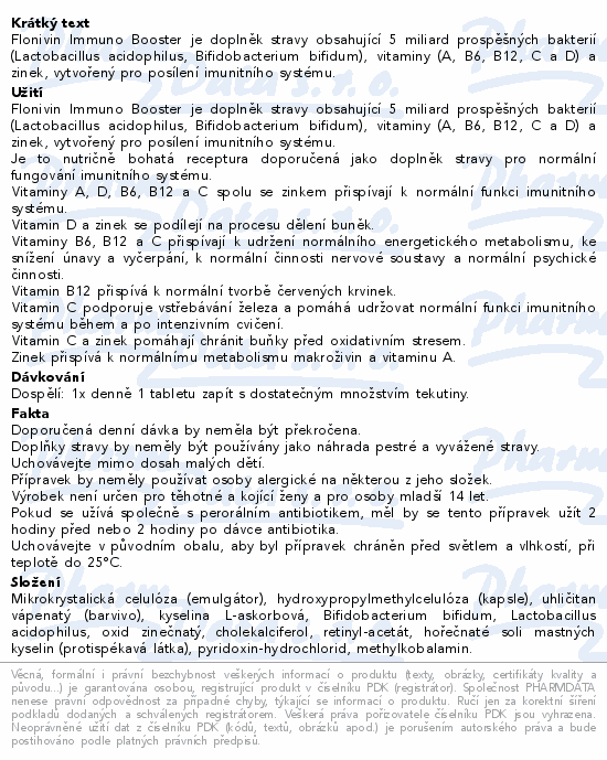 Flonivin Immuno Booster je doplněk stravy obsahující 5 miliard prospěšných bakterií (Lactobacillus acidophilus, Bifidobacterium bifidum), vitaminy (A, B6, B12, C a D) a zinek, vytvořený pro posílení imunitního systému.