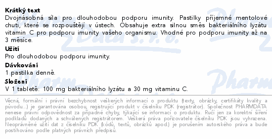 Dvojnásobná síla pro dlouhodobou podporu imunity. Pastilky příjemné mentolové chuti, které se rozpouštějí v ústech. Obsahuje extra silnou směs bakteriálního lyzátu vitamin C pro podporu imunity vašeho organismu. Vhodné pro podporu imunity až na 3 měsíce.