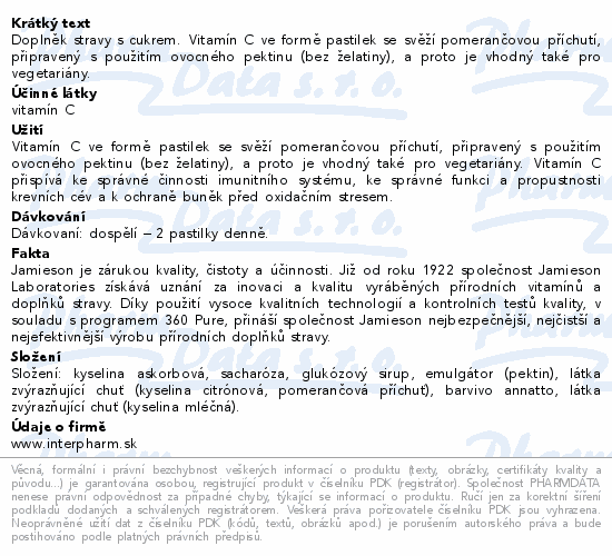 Doplněk stravy s cukrem. Vitamín C ve formě pastilek se svěží pomerančovou příchutí, připravený s použitím ovocného pektinu (bez želatiny), a proto je vhodný také pro vegetariány.