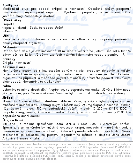 Medicinální sirup pro období chřipek a nachlazení. Obsažené složky podporují přirozenou obranyschopnost organizmu. Vyrobeno z propolisu, bylinek, vitamínu C a jablečné šťávy. Neobsahuje alkohol.
