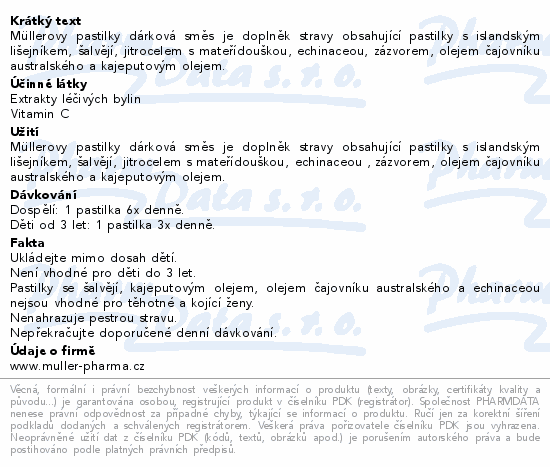 Müllerovy pastilky dárková směs je doplněk stravy obsahující pastilky s islandským lišejníkem, šalvějí, jitrocelem s mateřídouškou, echinaceou, zázvorem, olejem čajovníku australského a kajeputovým olejem.