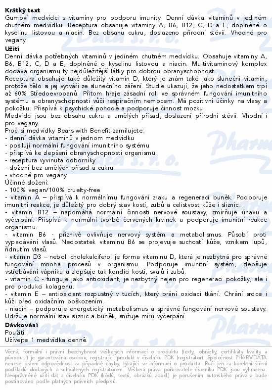 Gumoví medvídci s vitamíny pro podporu imunity. Denní dávka vitaminů v jediném chutném medvídku. Receptura obsahuje vitaminy A, B6, B12, C, D a E, doplněné o kyselinu listovou a niacin. Bez obsahu cukru, doslazeno přírodní stévií. Vhodné pro vegany.