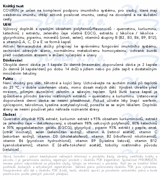 COVIRIN je určen na komplexní podporu imunitního systému, pro osoby, které mají oslabenou imunitu, chtějí aktivně posilovat imunitu, cestují na dovolené a na služební cesty.