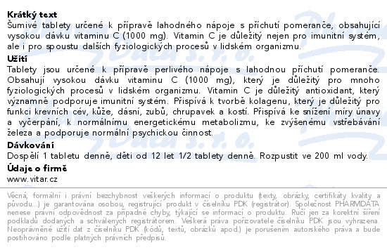 Šumivé tablety určené k přípravě lahodného nápoje s příchutí pomeranče, obsahující vysokou dávku vitaminu C (1000 mg). Vitamin C je důležitý nejen pro imunitní systém, ale i pro spoustu dalších fyziologických procesů v lidském organizmu.