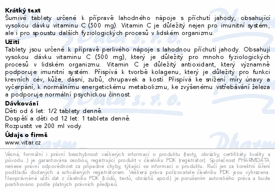 Šumivé tablety určené k přípravě lahodného nápoje s příchutí lesní jahody, obsahující vysokou dávku vitaminu C (500 mg). Vitamin C je důležitý nejen pro imunitní systém, ale i pro spoustu dalších fyziologických procesů v lidském organizmu.