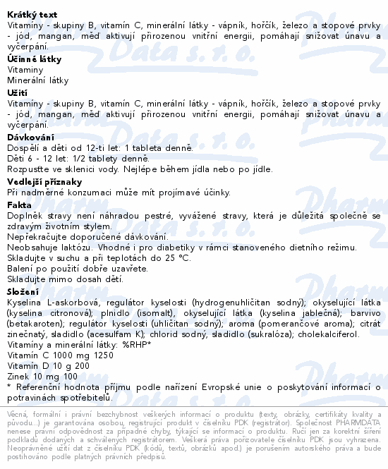 Vitamíny - skupiny B, vitamín C, minerální látky - vápník, hořčík, železo a stopové prvky - jód, mangan, měď aktivují přirozenou vnitřní energii, pomáhají snižovat únavu a vyčerpání.