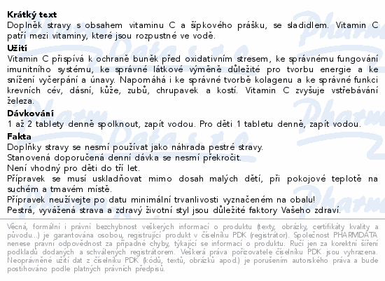 Doplněk stravy s obsahem vitaminu C a šípkového prášku, se sladidlem. Vitamin C patří mezi vitaminy, které jsou rozpustné ve vodě.