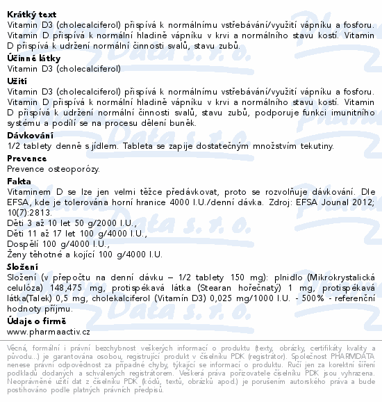 Vitamin D3 (cholecalciferol) přispívá k normálnímu vstřebávání/využití vápníku a fosforu. Vitamin D přispívá k normální hladině vápníku v krvi a normálního stavu kostí. Vitamin D přispívá k udržení normální činnosti svalů, stavu zubů.