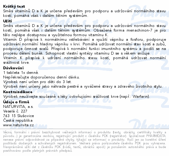 Směs vitamínů D a K je určena především pro podporu a udržování normálního stavu kostí, pomáhá však i dalším tělním systémům.