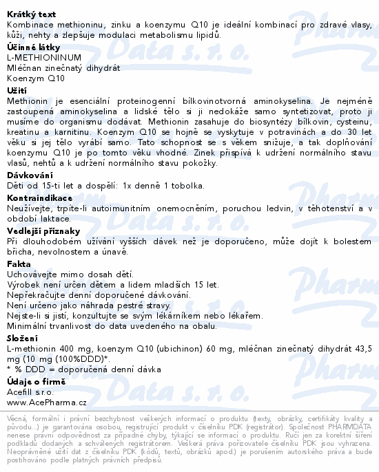 Kombinace methioninu, zinku a koenzymu Q10 je ideální kombinací pro zdravé vlasy, kůži, nehty a zlepšuje modulaci metabolismu lipidů.