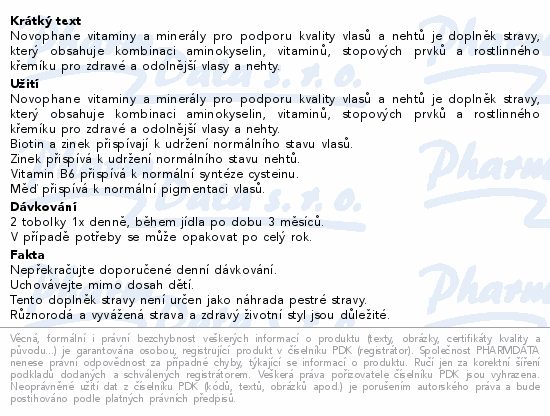 Novophane vitaminy a minerály pro podporu kvality vlasů a nehtů je doplněk stravy, který obsahuje kombinaci aminokyselin, vitaminů, stopových prvků a rostlinného křemíku pro zdravé a odolnější vlasy a nehty.