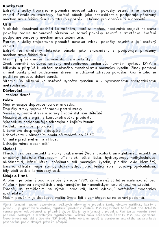 Extrakt z violky trojbarevné pomáhá uchovat zdraví pokožky zevnitř a její správný vzhled. Extrakt ze smetánky lékařské působí jako antioxidant a podporuje přirozený mechanismus čištění těla. Pro zdravou pokožku. Určeno pro dospívající a dospělé.