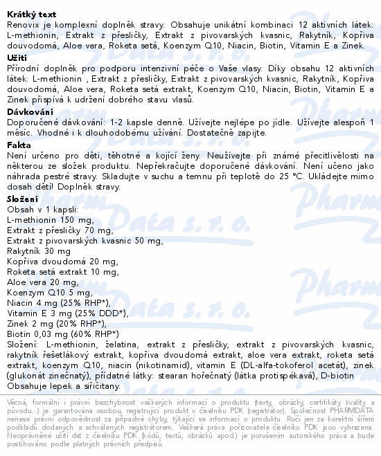 Renovix je komplexní doplněk stravy. Obsahuje unikátní kombinaci 12 aktivních látek: L-methionin, Extrakt z přesličky, Extrakt z pivovarských kvasnic, Rakytník, Kopřiva douvodomá, Aloe vera, Roketa setá, Koenzym Q10, Niacin, Biotin, Vitamin E a Zinek.