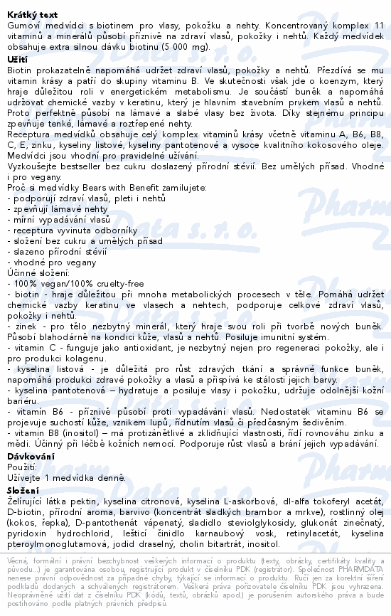 Gumoví medvídci s biotinem pro vlasy, pokožku a nehty. Koncentrovaný komplex 11 vitaminů a minerálů působí příznivě na zdraví vlasů, pokožky i nehtů. Každý medvídek obsahuje extra silnou dávku biotinu (5 000 mg).