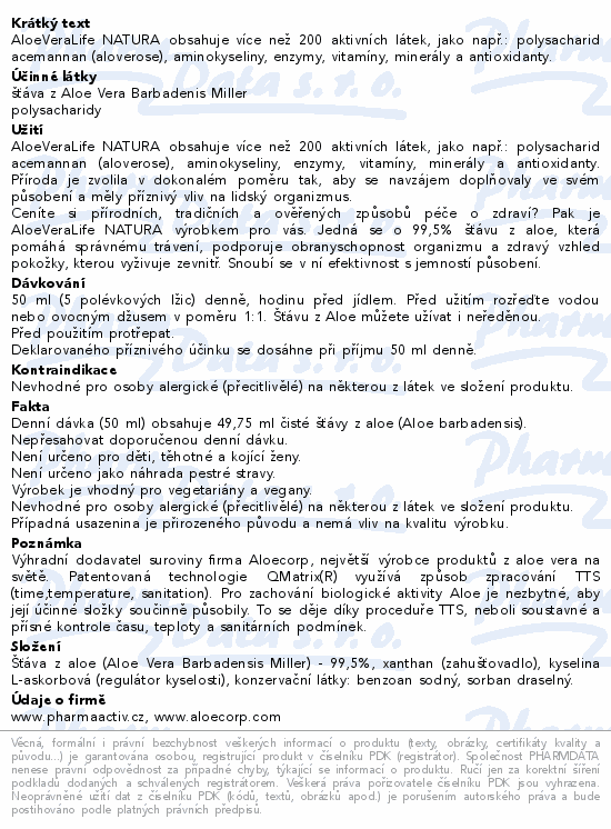 AloeVeraLife NATURA obsahuje více než 200 aktivních látek, jako např.: polysacharid acemannan (aloverose), aminokyseliny, enzymy, vitamíny, minerály a antioxidanty.