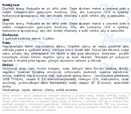 Doplněk stravy. Probuďte se do zářící pleti. Dejte sbohem matné a unavené pleti s našimi kolagenovými gumovými bonbóny. Díky síle koenzymu Q10 a kyseliny hyaluronové spolupracují, aby vám dodaly mladistvý a svěží vzhled, jaký si zasloužíte.