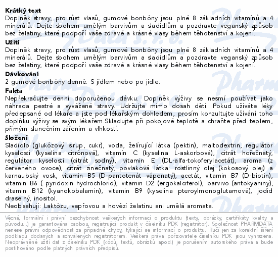 Doplněk stravy, pro růst vlasů, gumové bonbóny jsou plné 8 základních vitamínů a 4 minerálů. Dejte sbohem umělým barvivům a sladidlům a pozdravte veganský způsob bez želatiny, které podpoří vaše zdravé a krásné vlasy během těhotenství a kojení.