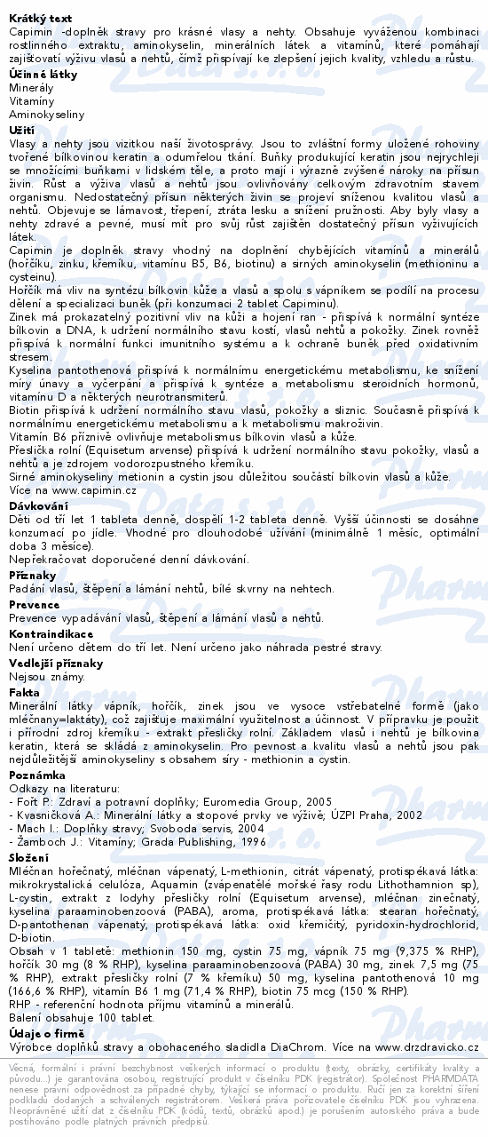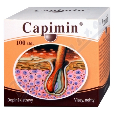 Capimin -doplněk stravy pro krásné vlasy a nehty. Obsahuje vyváženou kombinaci rostlinného extraktu, aminokyselin, minerálních látek a vitamínů, které pomáhají zajišťovatí výživu vlasů a nehtů, čímž přispívají ke zlepšení jejich kvality, vzhledu a růstu.